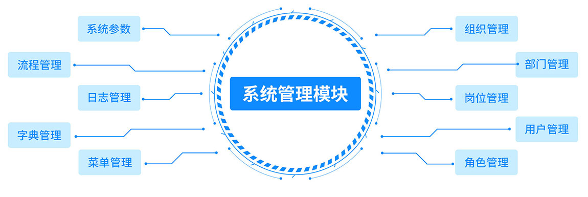 系統(tǒng)管理模塊提供各項(xiàng)基礎(chǔ)參數(shù)配置,用于支撐系統(tǒng)人員層級(jí)的管理和人員權(quán)限的控制以及離散屬性的配置如各項(xiàng)閥值等。包含組織管理、部門管理、崗位管理、角色管理、用戶管理、菜單管理、字典管理、日志管理、系統(tǒng)參數(shù)、流程管理。